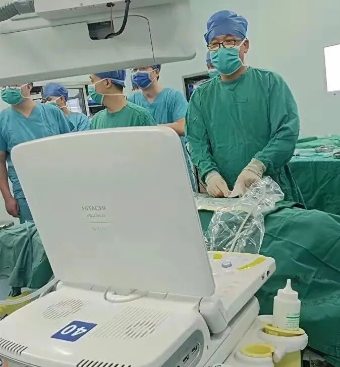 為此次手術(shù)經(jīng)皮腎超聲定位的是日立的泌尿?qū)I(yè)超聲,配置經(jīng)典的零角度穿刺探頭,應(yīng)用于經(jīng)皮腎穹隆部穿刺